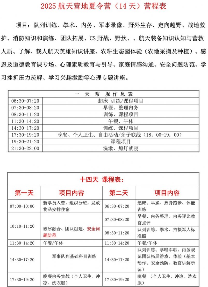 课程简介:14天军事夏令营,在这个伟大的时代,我们把中国航天英雄的精神和广州黄埔军校红色基因,融敬培养好青少年健康快乐茁壮成长是我们的职责与使命!